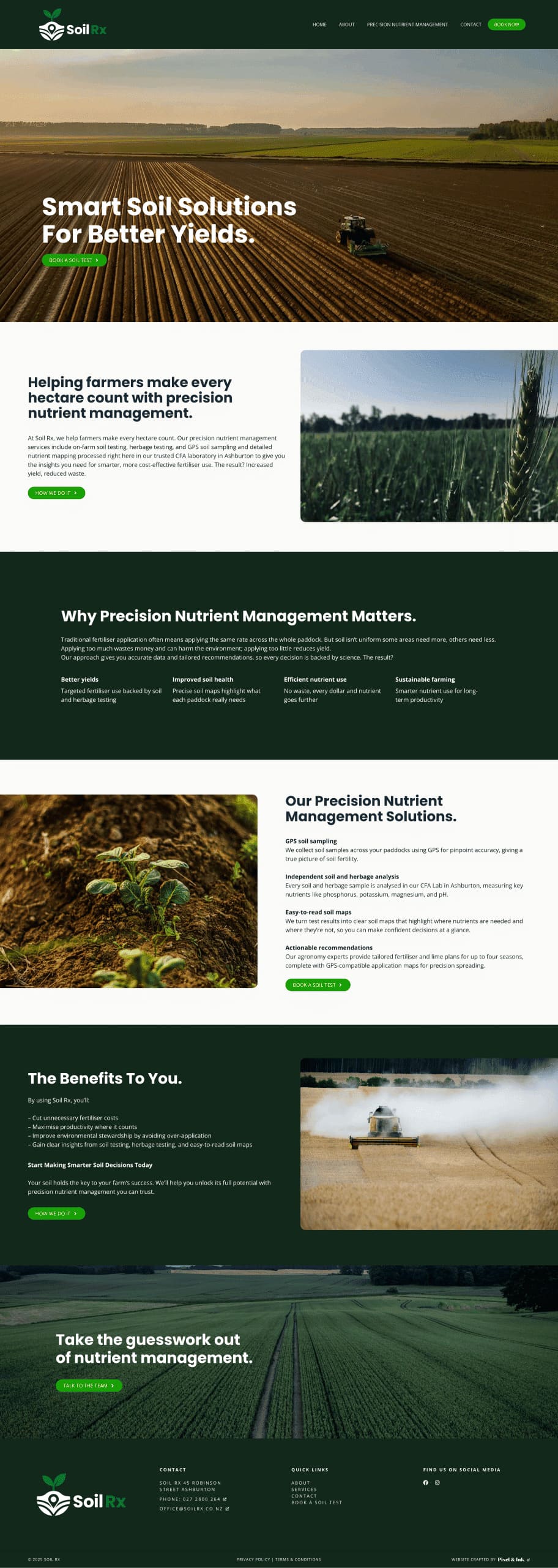 Soil Rx now has a professional, modern website that reflects their expertise and local roots. It clearly explains their services, supports farmer decision-making with easy access to information, and strengthens their visibility in search results. The site gives farmers confidence to engage with Soil Rx for testing, mapping, and recommendations.